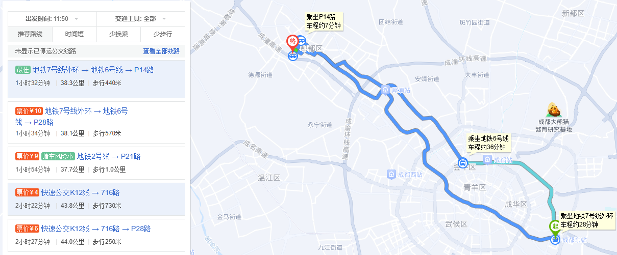 成都东站下车乘坐地铁7号线至【西南交大站】站内换乘地铁6号线至【和平街站】B出口下车,换乘公交P14路【顺河东街口站】下车