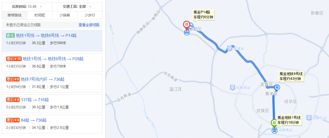 成都南站下车乘坐地铁1号线至【人民北路站】站内换乘地铁6号线至【和平街站】B出口下车,换乘公交P14路【顺河东街口站】下车