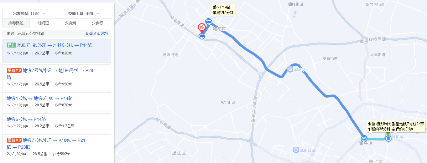 成都站下车乘坐地铁7号线至【西南交大站】站内换乘地铁6号线至【和平街站】B出口下车,换乘公交P14路【顺河东街口站】下车